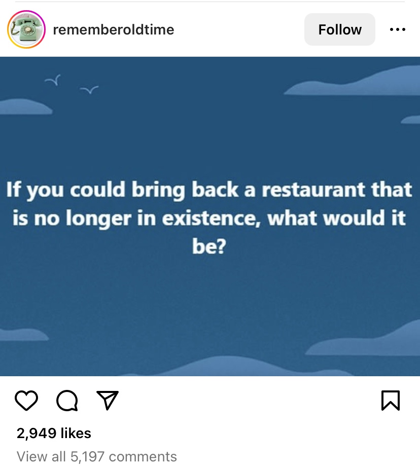 If you’re on Instagram, no doubt you’ve seen this post about bringing back a favorite restaurant from the past. For me, it would be a place called “W.C. Franks”. It served hot dogs and had a full video arcade (Pac-Man, Dig-Dug, Galaga, Centipede, Frogger, Donkey Kong, the works). Great times and great memories.