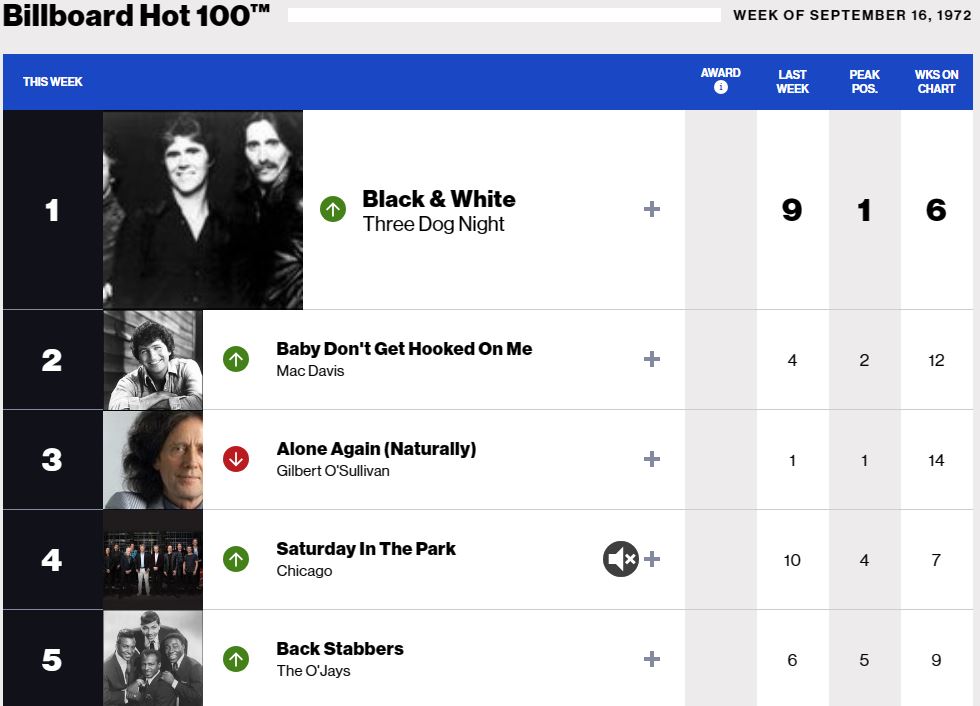 Let’s take a look at the music that was making waves in mid-September of 1972. Here are the top 5 singles from the Billboard Hot 100 chart at the time.