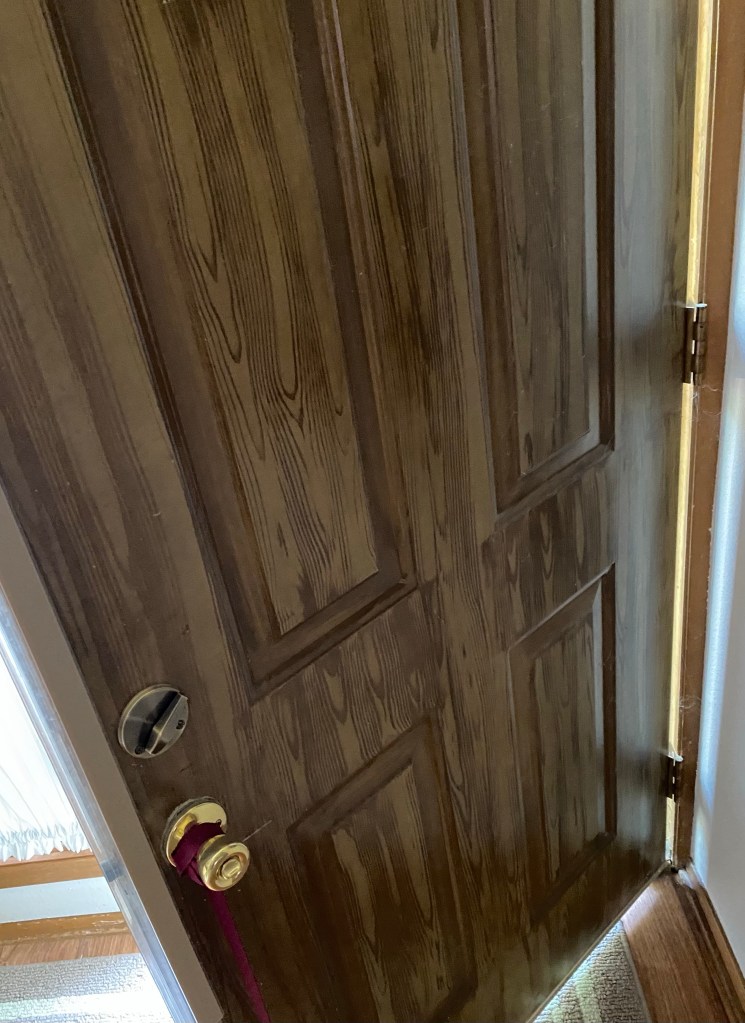 We have a front door that features a simulated wood grain on the inside, while the outside is painted a solid cream color to create contrast with the taupe hue of our house itself. When we close the door, our foyer becomes quite dark, which is why I’ve wanted to paint the indoor side of the door to brighten up the space. There’s no rush on this project, but I am excited about the transformation it will bring once completed.