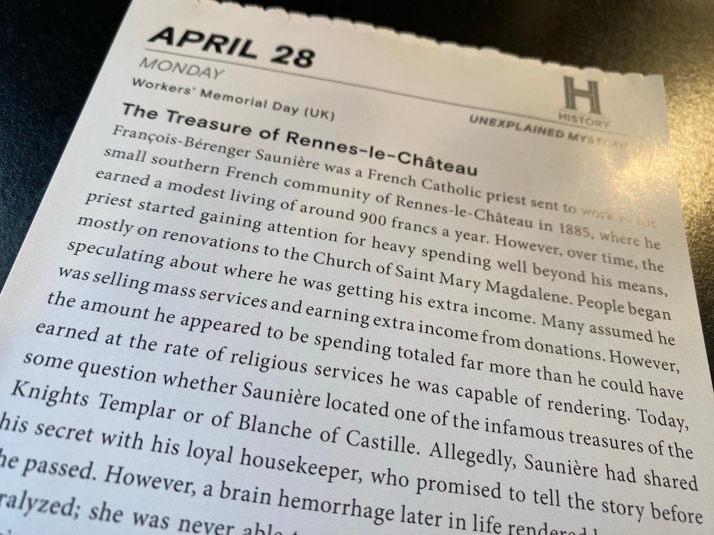 I’ve always enjoyed the page-a-day calendars that feature intriguing stories from history for every day of the year. Today’s post delves deeper into a mystery that today still remains unexplained. Who wouldn’t be fascinated by a story involving devils, treasure, “The DaVinci Code” and an untimely death?